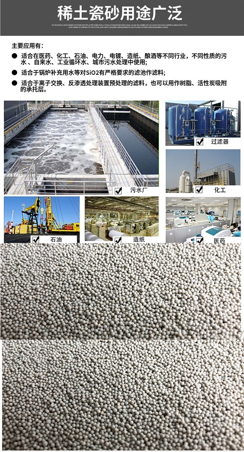 瓷砂濾料是一種球形顆粒,具有很好的穩(wěn)定化學性能,強度高,耐高溫 耐腐蝕比表面積大,截污吸附性能好,顆粒均勻,比重適中。稀土瓷砂濾料含油增強及耐腐蝕性的稀土,具有瓷砂濾料的性能外,吸附性能增強,化學穩(wěn)定性能好,適合做反滲透過濾和超濾介質。 在單層濾池 雙層濾池 雙層過濾器,離子交換器等過濾上班中作過濾介質及墊層,可以處理各種工業(yè)污水 工業(yè)用水 城市污水等。