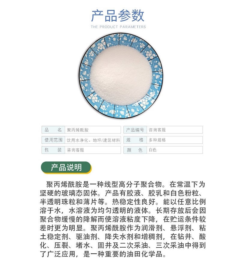 造紙助劑:在造紙工業(yè)中可用作紙張干強劑 助留劑 ,能極大的提高紙張質(zhì)量 節(jié)約成本,提高造紙廠的生產(chǎn)能力。可以直接與無機鹽離子,纖維以及其它有機高分子發(fā)生靜電橋梁作用以達(dá)到增強紙張的物理強度,減少纖維或填料的流失。加快濾水 起到了增強 助留 助濾的作用,同時在脫模過程中起到了明顯的絮凝效果。
